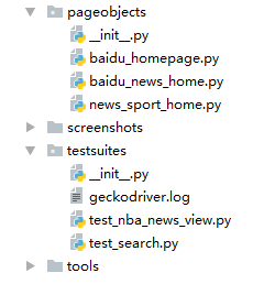 练习场景:新建了2个页面对象:百度新闻首页,百度体育新闻首页,具体文件结构如下图,其他和之前项目层级结构保持不变。