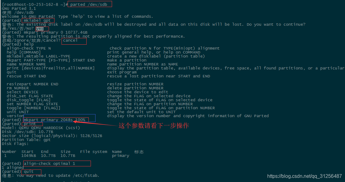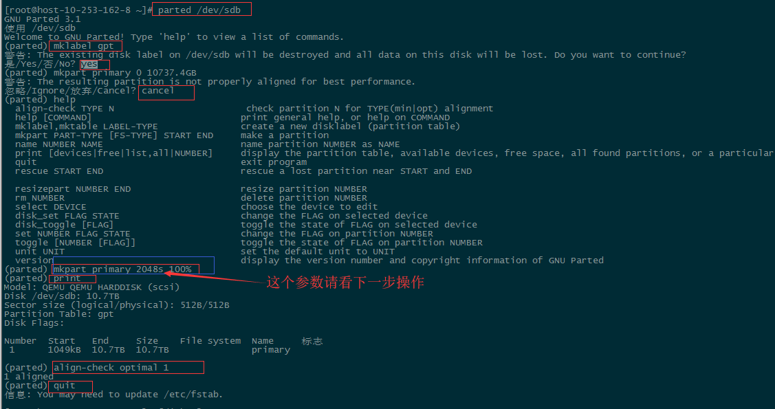 4.对新磁盘进行分区,由于fdisk仅支持2T以内磁盘分区,但该磁盘大于2T,所以使用parted进行GPT格式分区: