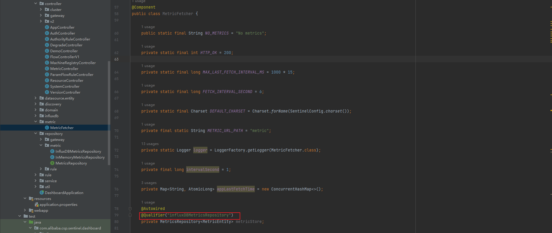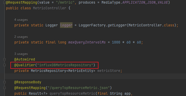 涉及到引用MetricsRepository的类有两个,分别是MetricFetcher和MetricController,将其采用@Qualifier("influxDBMetricsRepository")的方式,指定注入的Bean