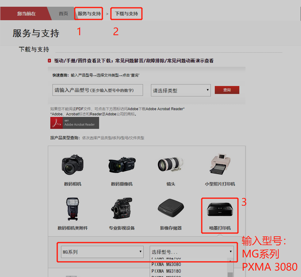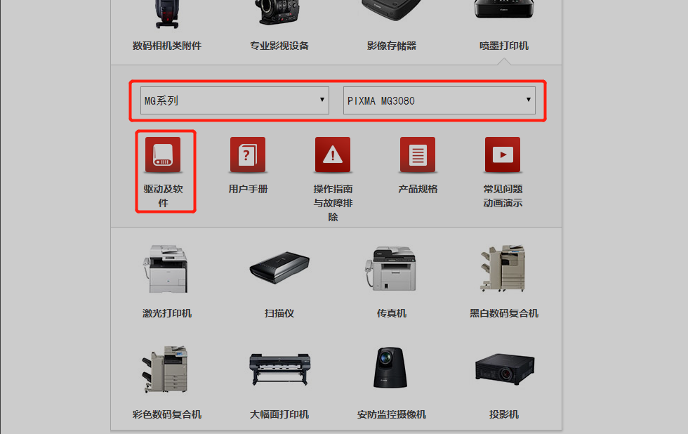 百度搜索“佳能官网"->服务与支持->下载与支持,看到喷墨打印机的图标点击选中,提示输入型号,选择"MG系列","PIXMA MG3080"型号。
