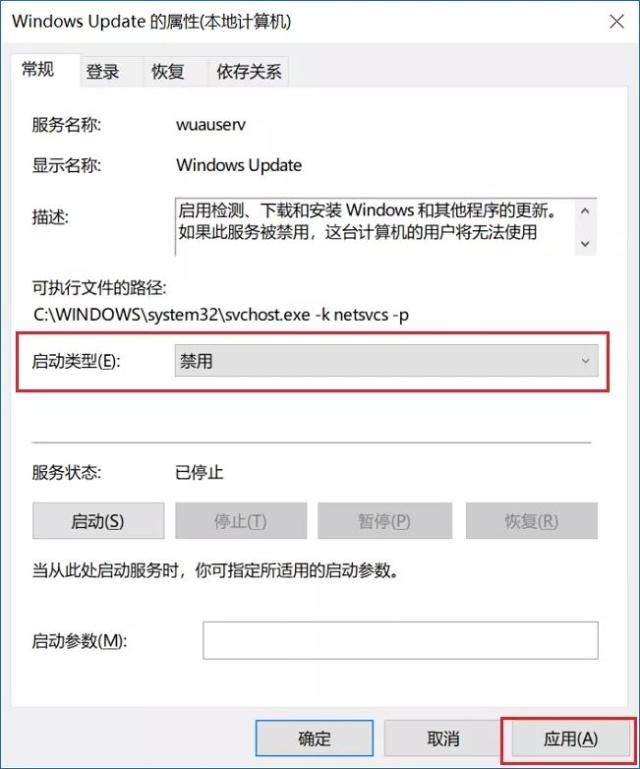 3、然后在Windows Update属性设置中,将启动类型改为「 禁用 」,再点击下方的「 停止 」,最后再点击底部的「 应用 」保存设置,如下图所示。
