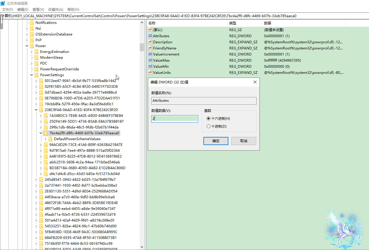 2.在注册表中,在此路径"计算机\HKEY_LOCAL_MACHINE\SYSTEM\CurrentControlSet\Control\Power\PowerSettings\238C9FA8-0AAD-41ED-83F4-97BE242C8F20\7bc4a2f9-d8fc-4469-b07b-33eb785aaca0"下找到"Attributes"配置选项。