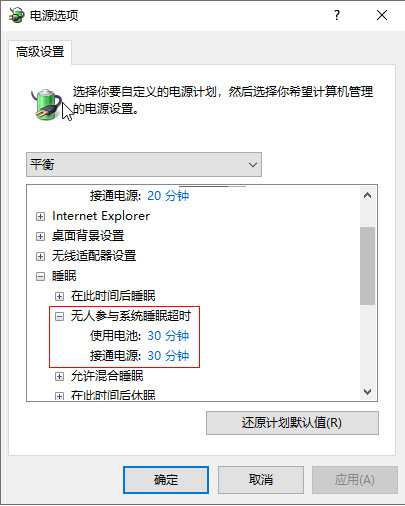 4.控制面板-->系统安全-->电源选项-->更改计算机睡眠时间-->进入高级电源设置-->睡眠-->"无人参与睡眠超时",延长系统默认的2分钟。我将默认2分钟改为半小时。