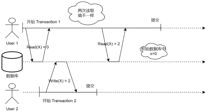 上图为read-commited隔离级别,存在不可重复读的问题。