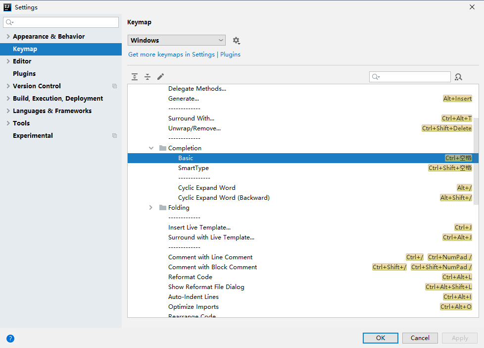 File->Settings->keymap->Main menu->code->Completion->Basic