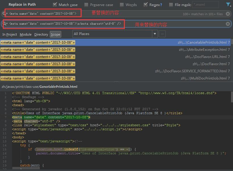 全局替换和全局搜索类似,只是多了替换操作。 1、通过快捷键Ctrl+Shift+R打开窗口,或者通过点击Edit–>Find–>Replace in path打开窗口。比搜索窗口多了填写替换内容的输入框,如下图: