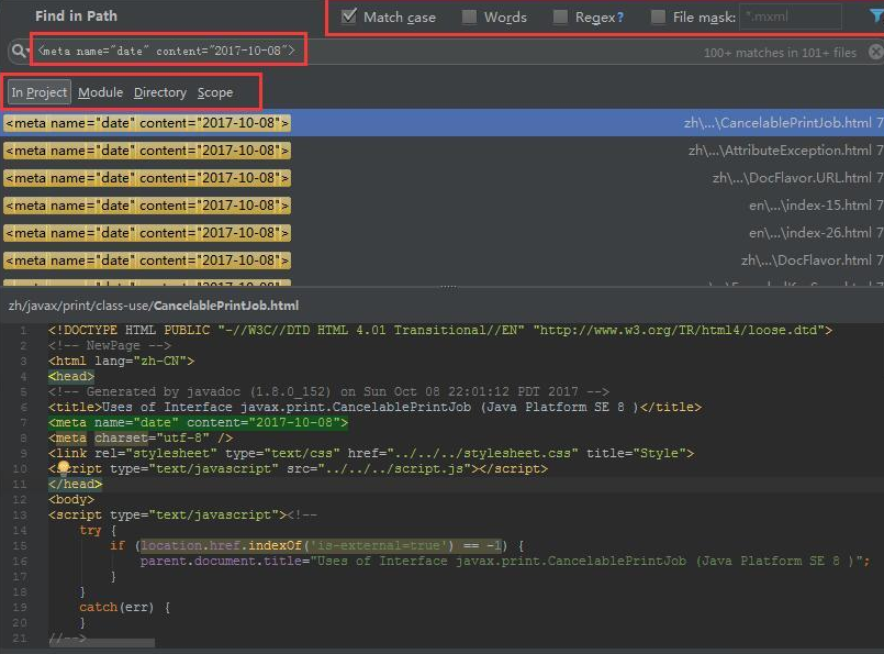 3、搜索范围包括整个项目In project、模块module、指定目录directory、指定范围scope。 4、通过勾选顶部的条件复选框,可以实现正则搜索、指定文件后缀等。