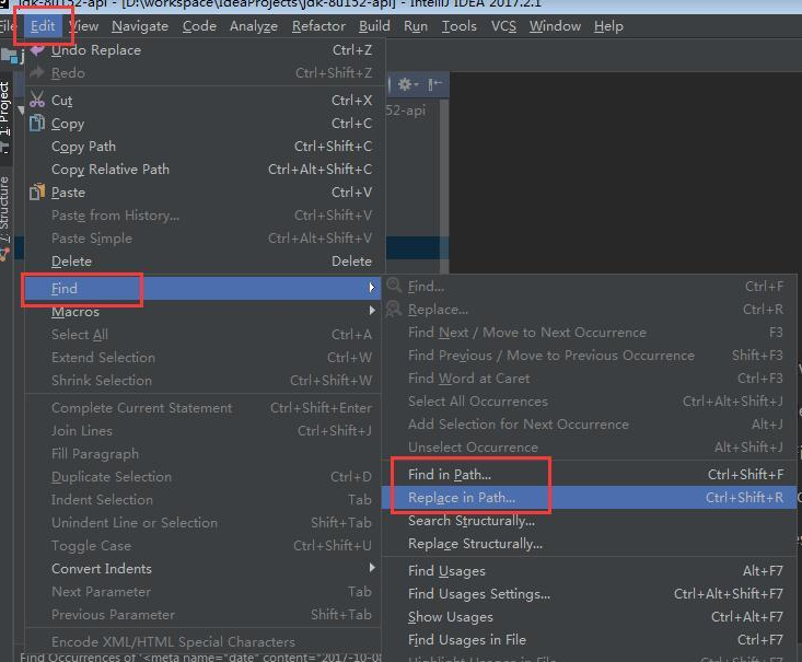 1、使用快捷键Ctrl+Shift+F打开搜索窗口,或者通过点击Edit–>Find–>Find in path打开搜索窗口,如下图: