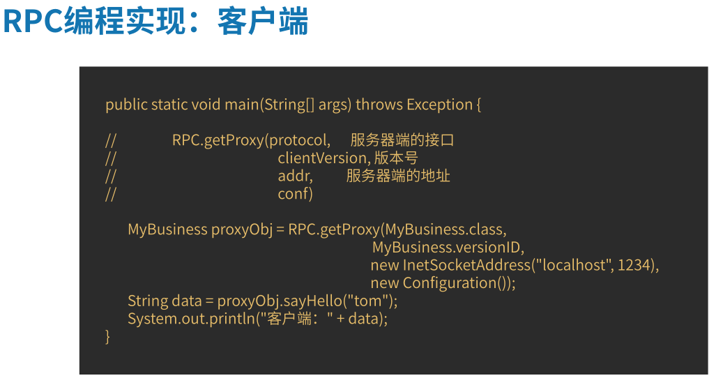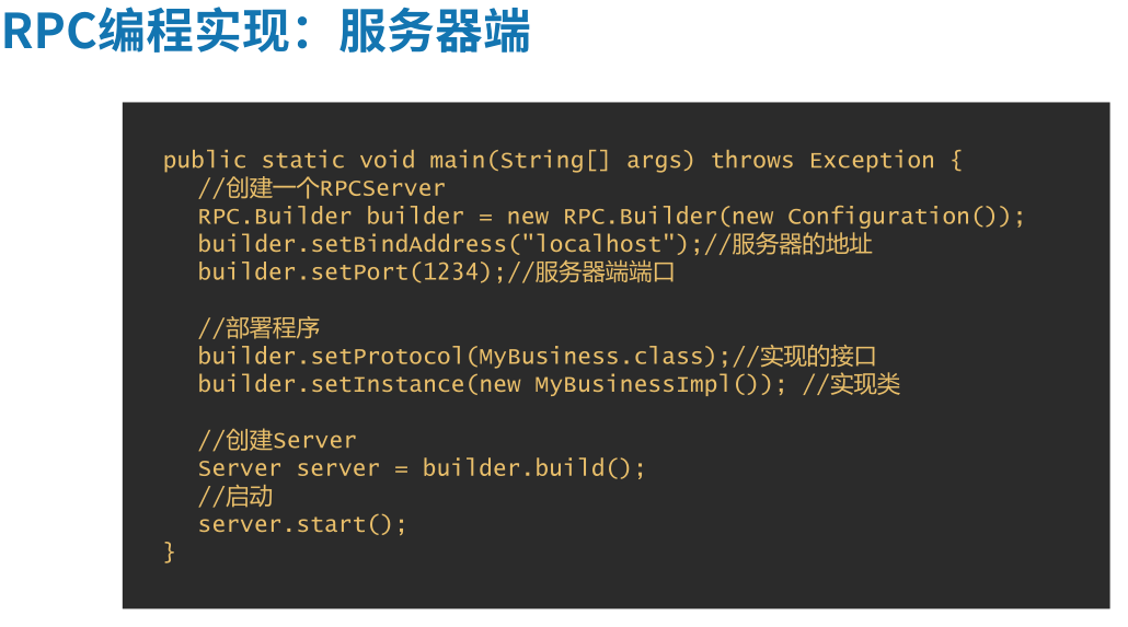 - 服务器那边一样的,需要针对你自己的服务生成一个动态代理,监听某个网络端口了,然后代理你本地的服务代码。接收到请求的时候,就调用对应的服务代码,对吧。