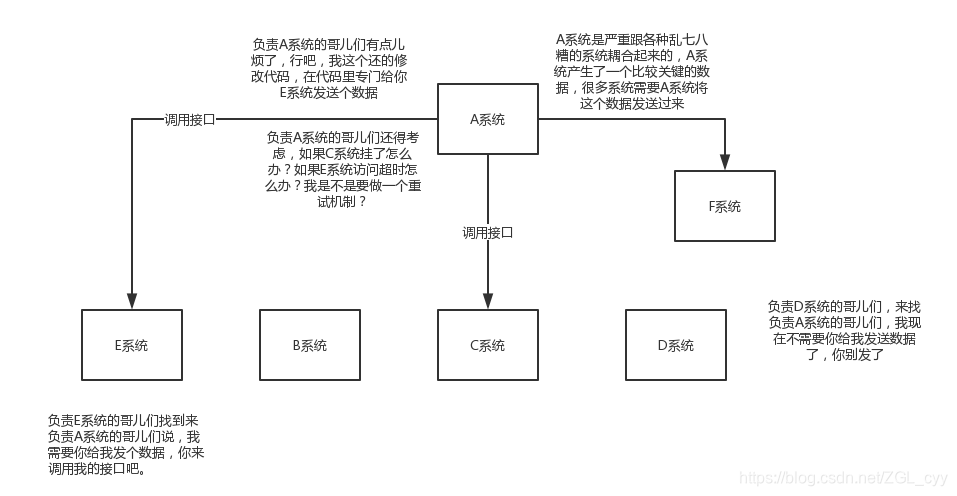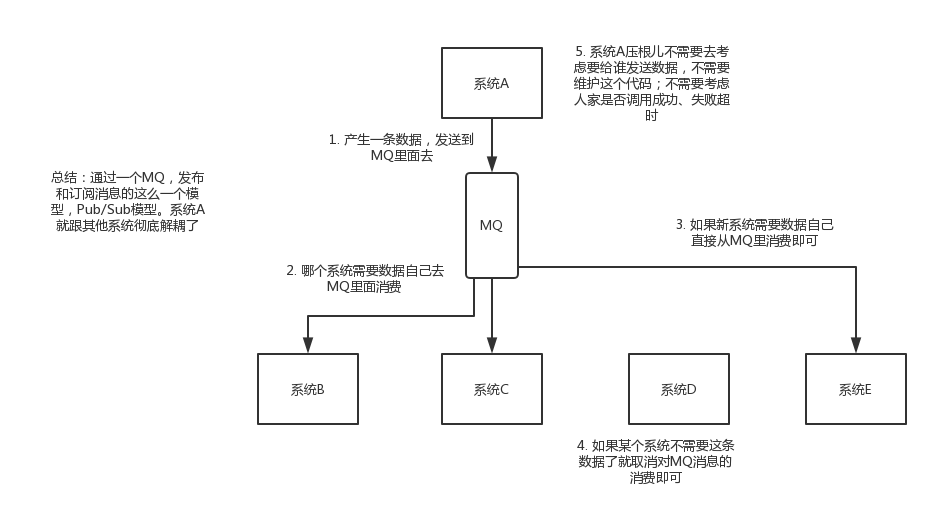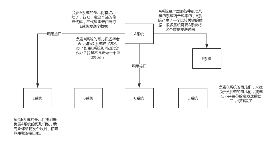 现场画个图来说明一下,A系统发送个数据到BCD三个系统,接口调用发送,那如果E系统也要这个数据呢?那如果C系统现在不需要了呢?现在A系统又要发送第二种数据了呢?A系统负责人濒临崩溃中。。。再来点更加崩溃的事儿,A系统要时时刻刻考虑BCDE四个系统如果挂了咋办?我要不要重发?我要不要把消息存起来?头发都白了啊。。。