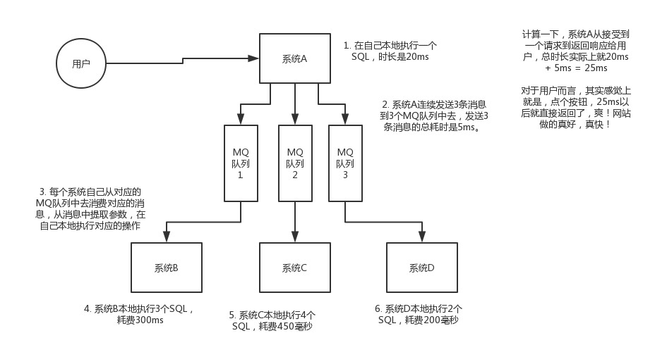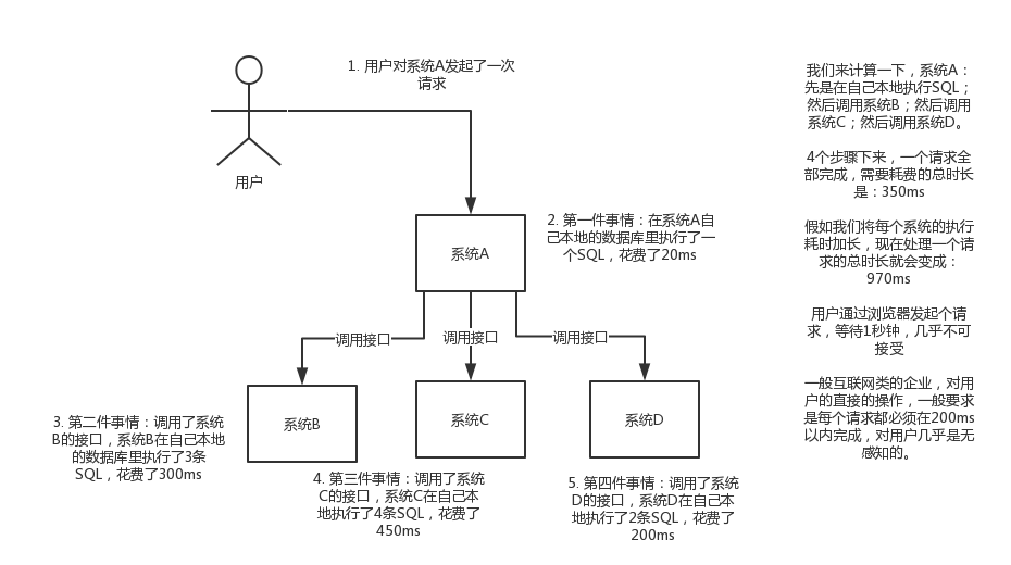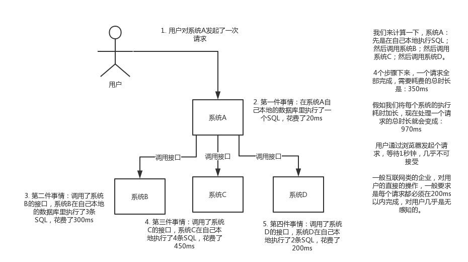 现场画个图来说明一下,A系统接收一个请求,需要在自己本地写库,还需要在BCD三个系统写库,自己本地写库要3ms,BCD三个系统分别写库要300ms、450ms、200ms。最终请求总延时是3 + 300 + 450 + 200 = 953ms,接近1s,用户感觉搞个什么东西,慢死了慢死了。