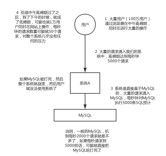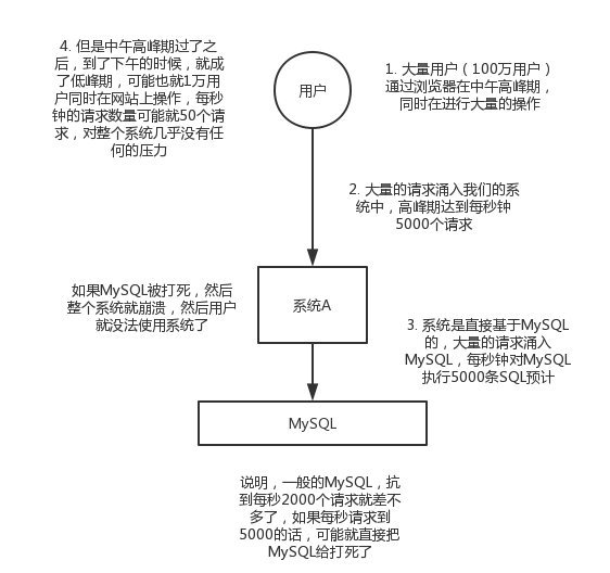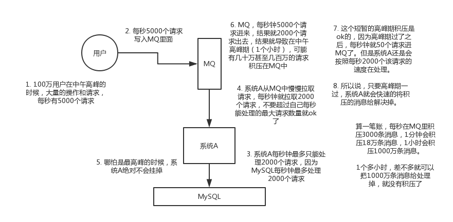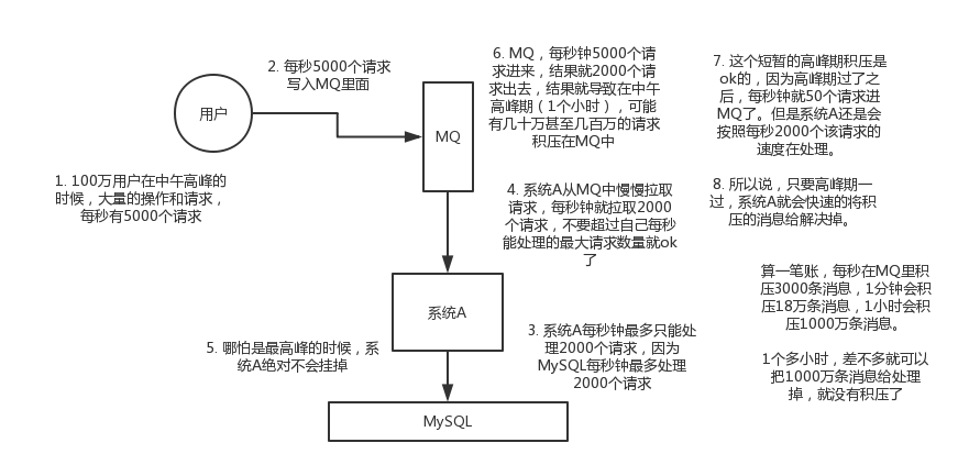 每天0点到11点,A系统风平浪静,每秒并发请求数量就100个。结果每次一到11点~1点,每秒并发请求数量突然会暴增到1万条。但是系统最大的处理能力就只能是每秒钟处理1000个请求啊。。。尴尬了,系统会死。。。