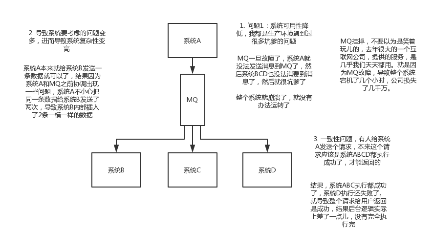 1.系统可用性降低(MQ挂了):系统引入的外部依赖越多,越容易挂掉,本来你就是A系统调用BCD三个系统的接口就好了,人ABCD四个系统好好的,没啥问题,你偏加个MQ进来,万一MQ挂了咋整?MQ挂了,整套系统崩溃了,你不就完了么。