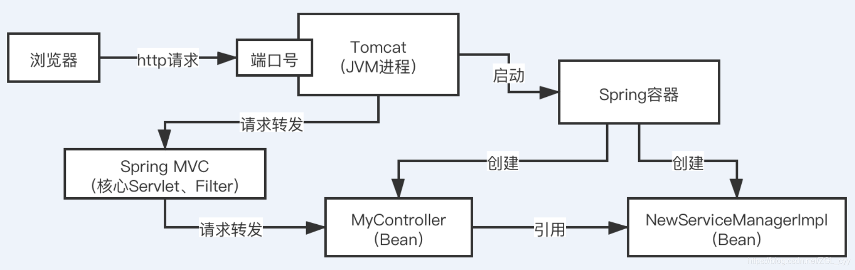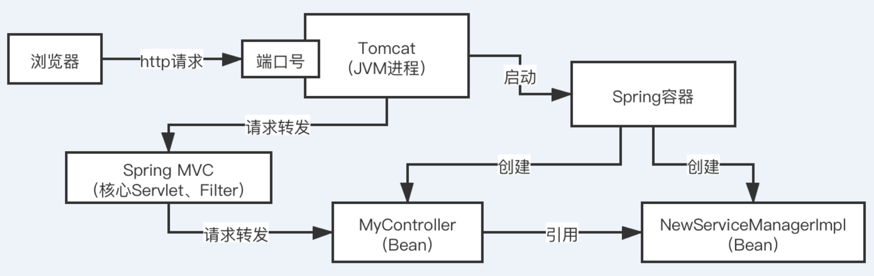 写一套系统,web服务器,tomcat,一旦启动之后,他就可以监听一个端口号的http请求,然后可以把请求转交给你的servlet,jsp,配合起来使用的,servlet处理请求