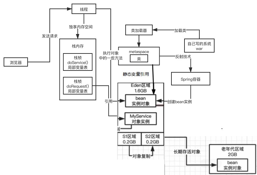 tomcat,类都会加载到jvm里去,spring容器而言都会对我们的类进行实例化成bean,有工作线程会来执行我们的bean实例对象里的方法和代码,进而也会创建其他的各种对象,实现业务逻辑