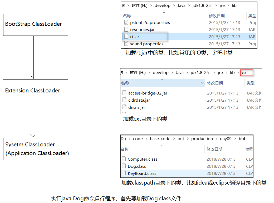 • 1.Bootstrap ClassLoader 根类加载器,也被称为引导类加载器,负责Java核心类的加载,比如System,String等。在JDK中jre的lib目录下rt.jar文件中