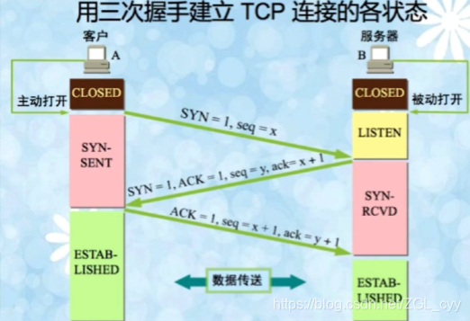 解析:seq是序列号,这是为了连接以后传送数据用的,ack是对收到的数据包的确认,值是等待接收的数据包的序列号。 在第一次消息发送中,A随机选取一个序列号作为自己的初始序号发送给B;第二次消息B使用ack对A的数据包进行确认,因为已经收到了序列号为x的数据包,准备接收序列号为x+1的包,所以ack=x+1,同时B告诉A自己的初始序列号,就是seq=y;第三条消息A告诉B收到了B的确认消息并准备建立连接,A自己此条消息的序列号是x+1,所以seq=x+1,而ack=y+1是表示A正准备接收B序列号为y+1的数据包。