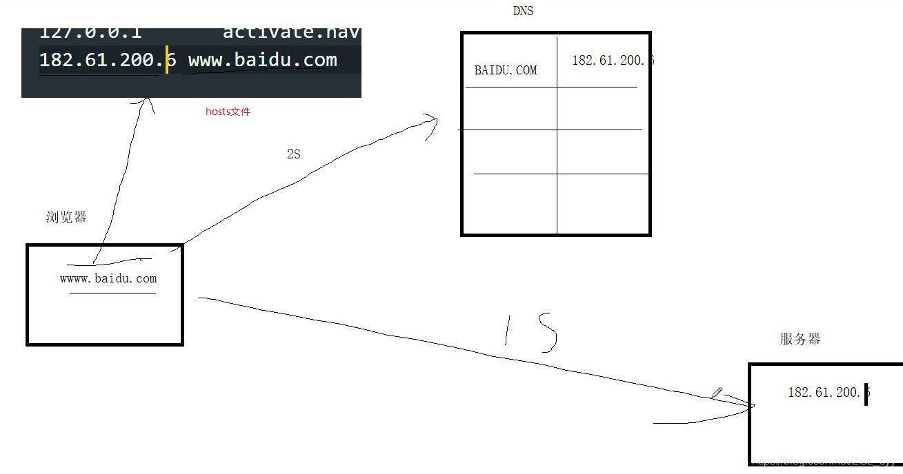 1.在host配置的文件先进行访问之后到DNS服务器寻找然后解析ip地址