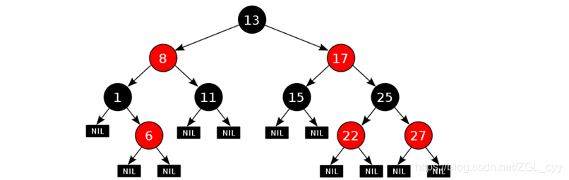 如果一个节点没有子节点或者父节点,则该节点相应的指针属性值为Nil,这些Nil视为叶节点,每个叶节点(Nil)是黑色的