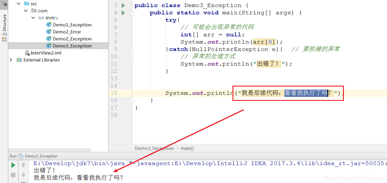 catch里面是在try出现异常后转到的部分,不出现异常的话,这部分不会执行