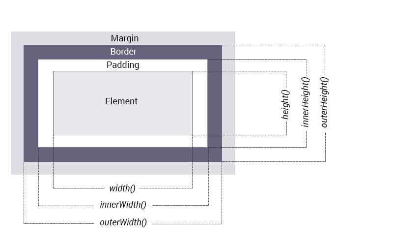 width() 和 height() 方法获取并设置尺寸,而不包括填充,边框和边距。