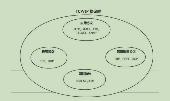 从字面意义上讲,有人可能会认为 TCP/IP 是指 TCP 和 IP 两种协议。实际生活当中 有时也确实就是指这两种协议。然而在很多情况下,它只是利用 IP 进行通信时所必须用到 的协议群的统称。具体来说,IP 或 ICMP、TCP 或 UDP、TELNET 或 FTP、以及 HTTP 等都属于 TCP/IP 协议。他们与 TCP 或 IP 的关系紧密,是互联网必不可少的组成部分。 TCP/IP 一词泛指这些协议,因此,有时也称 TCP/IP 为网络协议群。