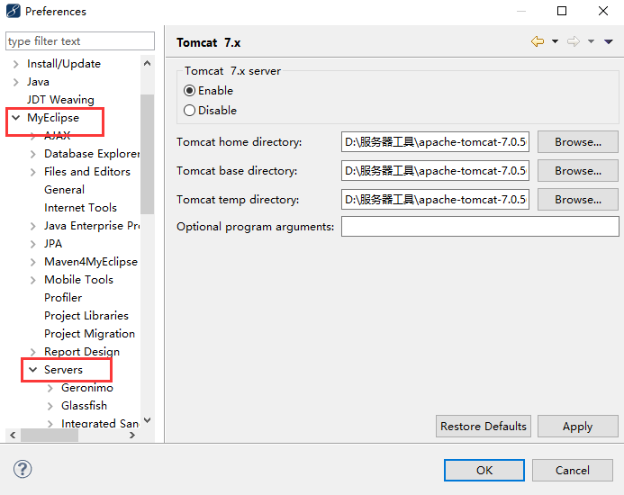 Myeclipse集成Tomcat(eclipse同理): 将 tomcat 的目录和 Myeclipse 集成起来,这样 Myeclipse 在帮我们复制更改的代码的时候,就知道复制到哪个服务器中。