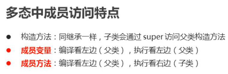 编译看父类,运行看父类 (引用成员变量要看父类是否有,运行结果也是父类结果,因为还是父类是声明类)