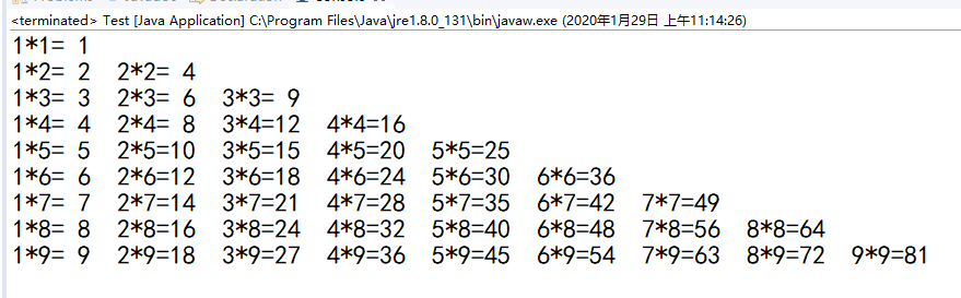 System.out.print(j + "*" + i + "=" + (i * j < 10 ? (" " + i * j) : i * j) + " ");