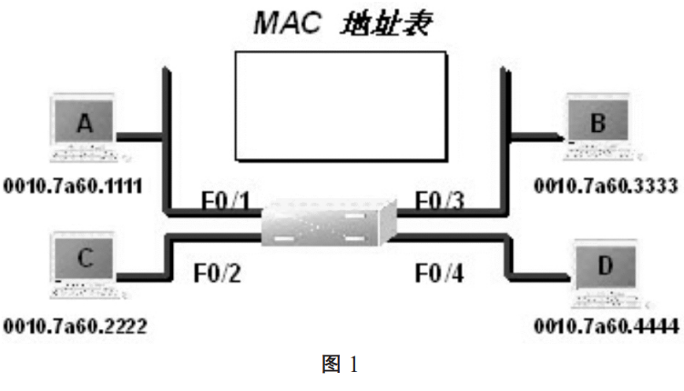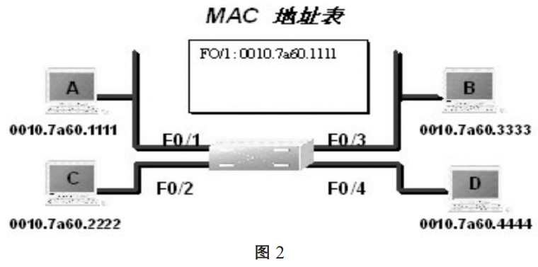 假设主机 A 给主机 C 发送数据。交换机从 F0/1 端口接到了这个数据帧之后, 就来查找其 MAC 地址表。由于 MAC 地址表为空, 则向除了F0/1 口以外的所有端口转发该帧。同时, 交换机就会学习到主机MAC 地址 0010.7a60.1111 与端口 F0/1 相对应, 于是这个记录就被记录到 MAC 地址表中, 如图 2 所示。