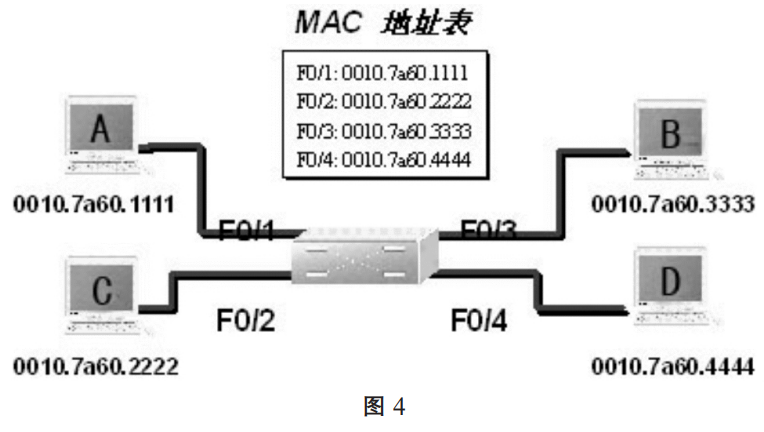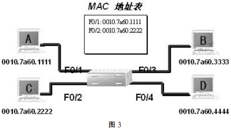 现在假设主机 B 给主机 A 发送数据。同理, 交换机添加主机 B 的 MAC 地址到地址表中, 不过, 此时, 交换机并不转发该数据帧, 因为交换机知道主机 A 的位置, 所以交换机只向端口 F0/1 发送数据。经过不断循环这样一个学习的过程, 直到连接到交换机的 MAC地址表最终建立完毕, 如图 4 所示。此时如果有数据帧到来, 交换机就会根据 MAC 地址表中相应的条目进行转发。