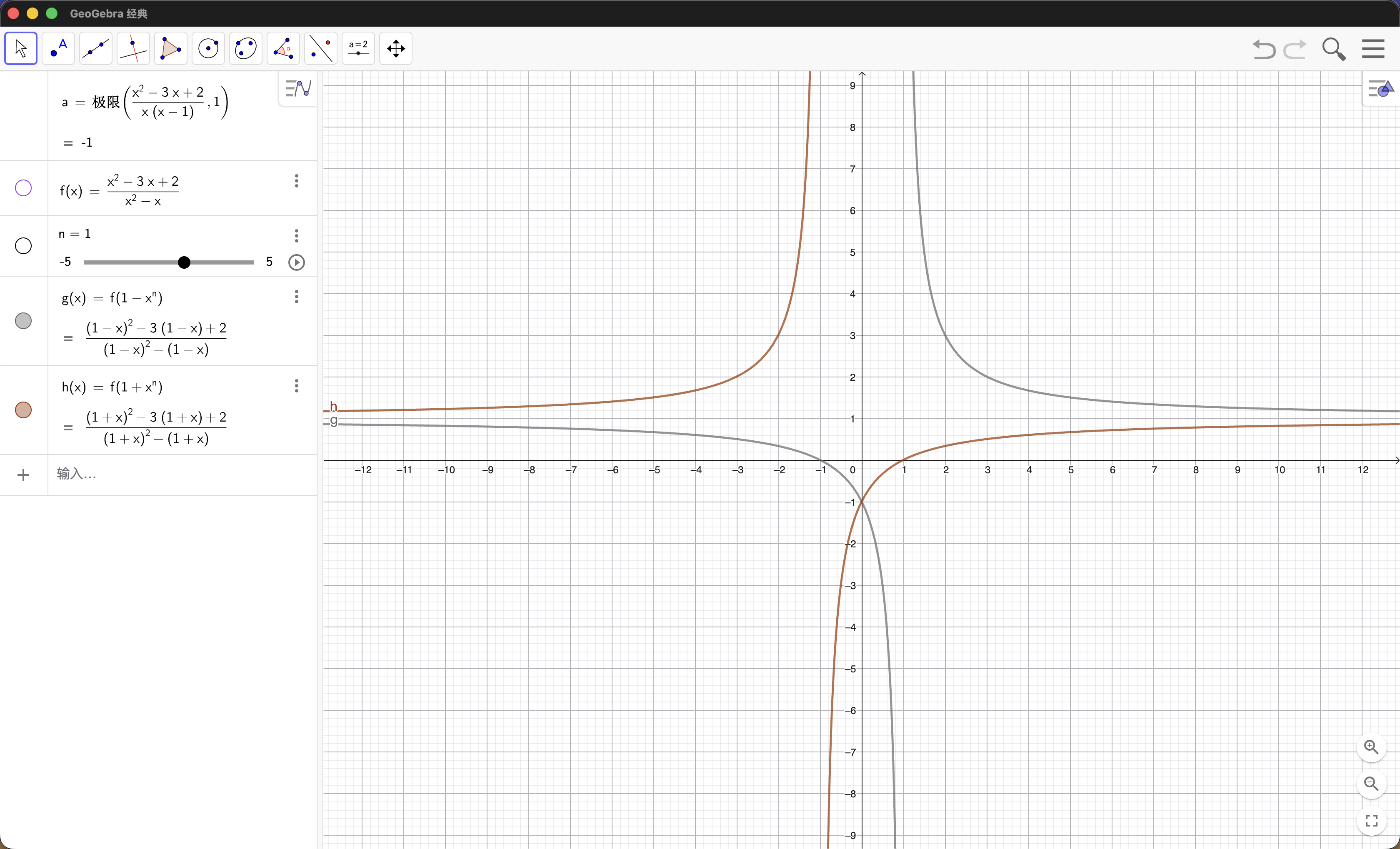 第 \(1\) 题:记 \(f(x) = \frac{x^2 - 3x + 2}{x^2 - x}\),请用 Excel 计算 \(f(1 - 0.1^n)\) 和 \(f(1 + 0.1^n)\),观察并思考其中出现的问题。