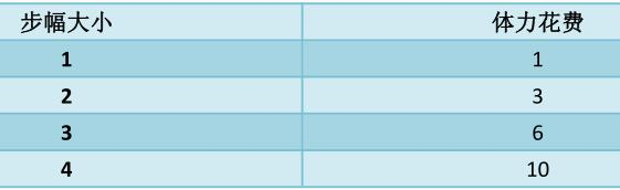 明明上n 级台阶可用四种步幅, 当然每种步幅花费的体力也不一样, 对应关系如下