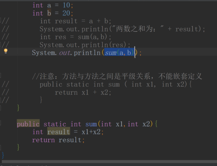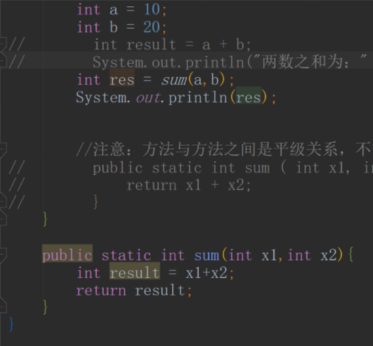 注意:方法与方法之间是平级关系,不能嵌套定义(就是说一个方法不能在另一个方法的大括号内)
