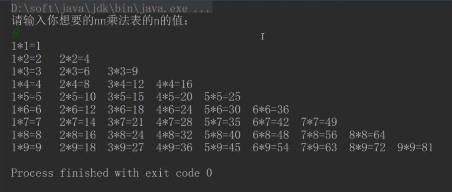 案例2:键盘录入一个数据n(1<=n<=9),输出对应的nn乘法表