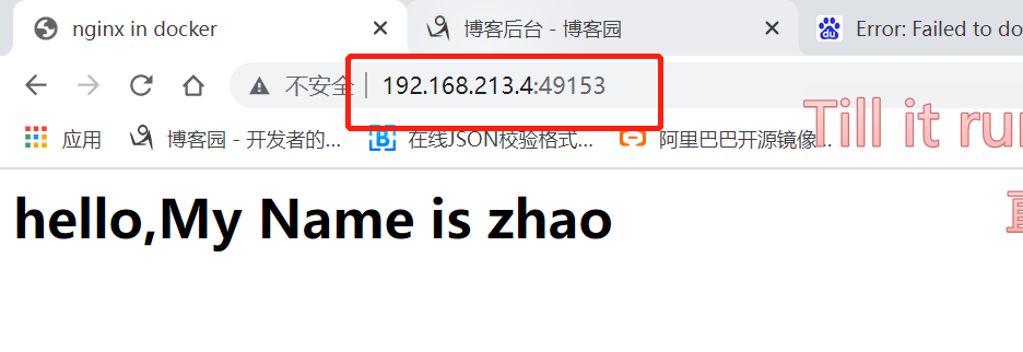 vim index.html <html> <head> <title>nginx in docker</title> </head> <body> <h1>hello,My Name zhao</h1> </body> </html>