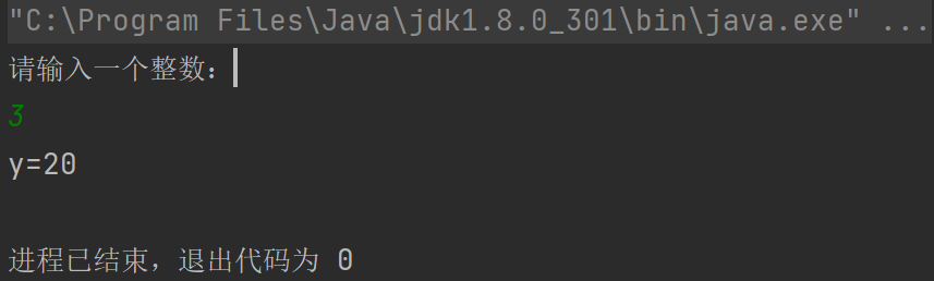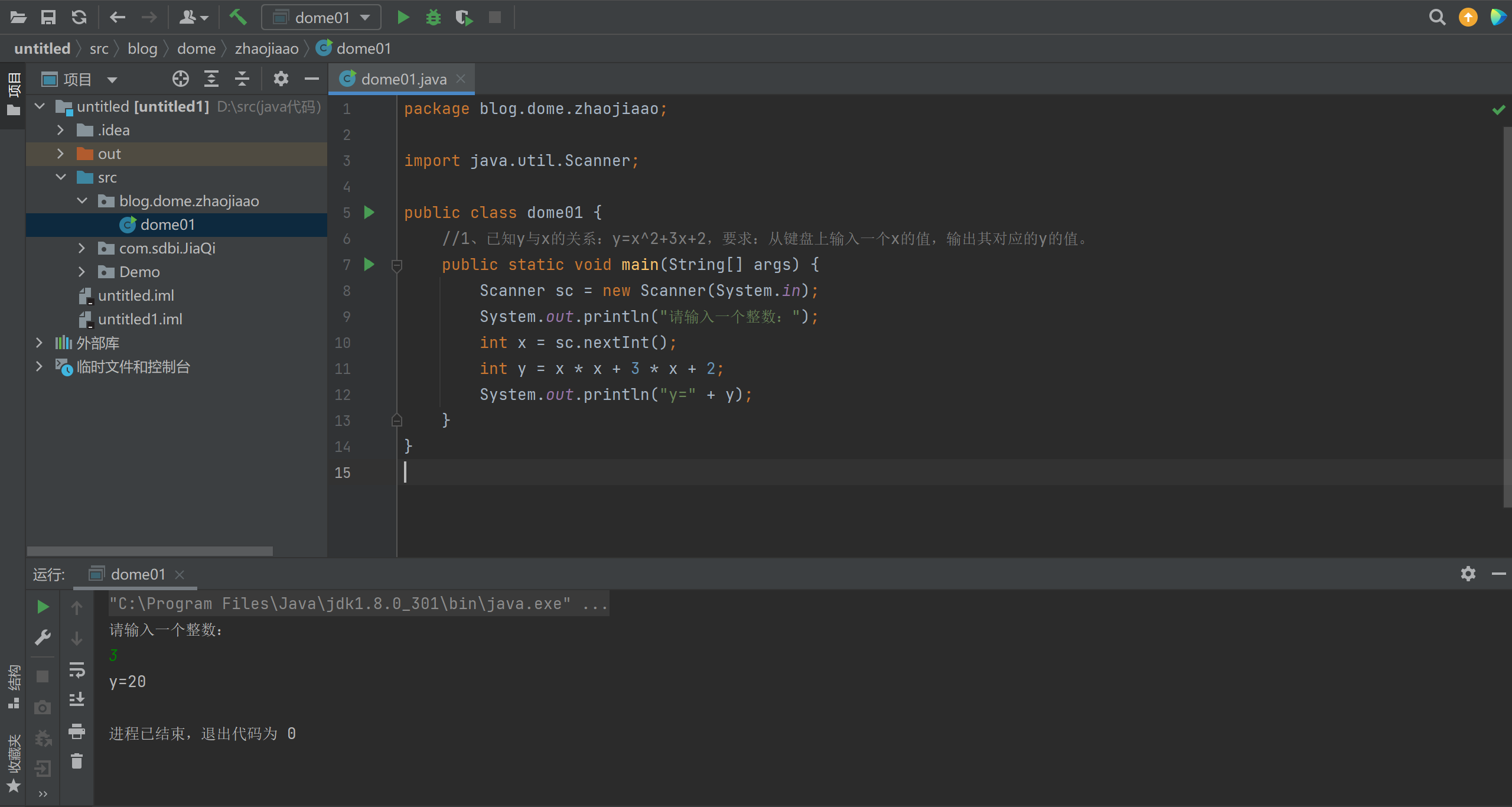 package blog.dome.zhaojiaao; import java.util.Scanner; public class dome01 { //1、已知y与x的关系:y=x^2+3x+2,要求:从键盘上输入一个x的值,输出其对应的y的值。 public static void main(String[] args) { Scanner sc = new Scanner(System.in); System.out.println("请输入一个整数:"); int x = sc.nextInt(); int y = x * x + 3 * x + 2; System.out.println("y=" + y); } }