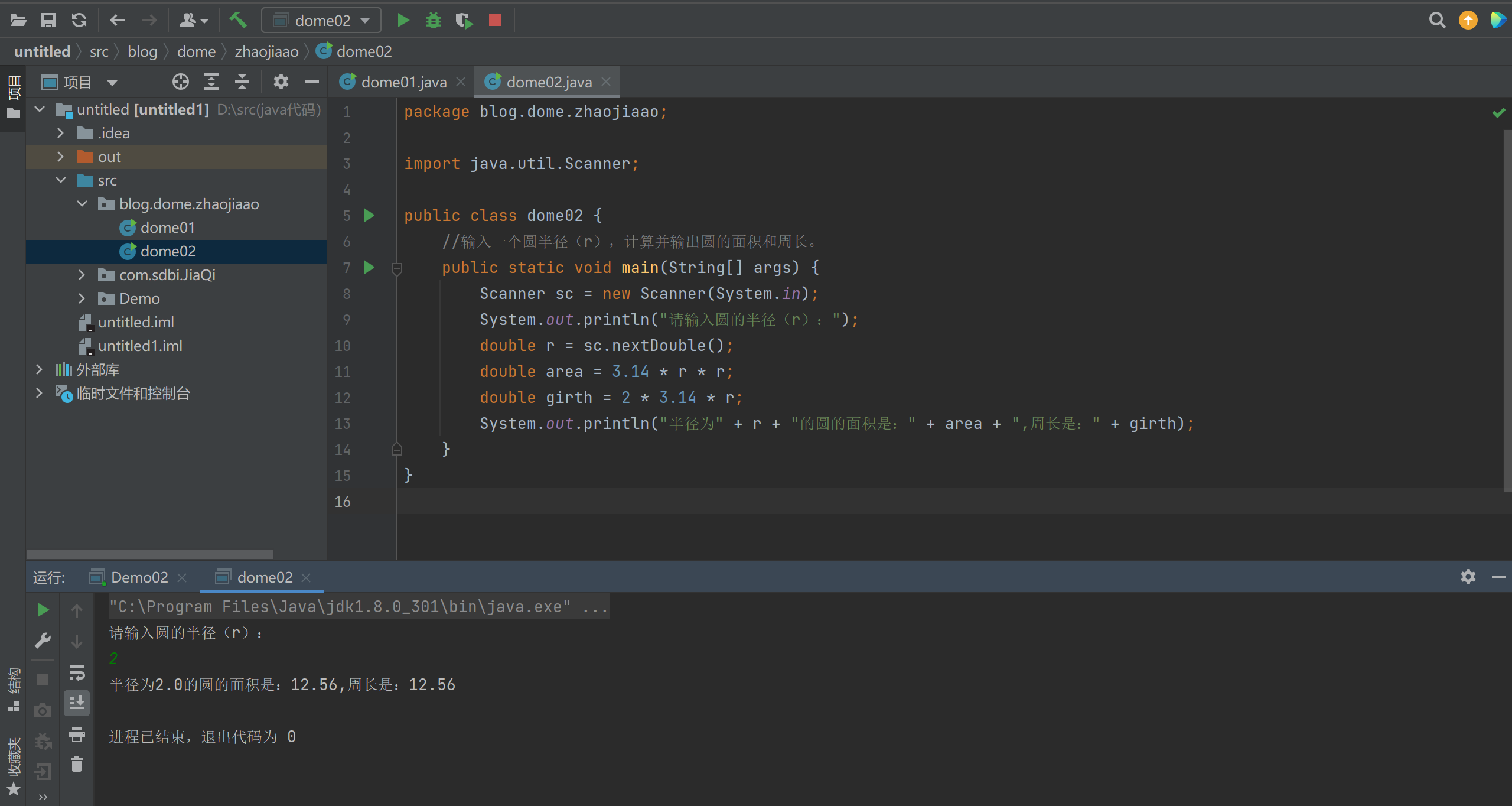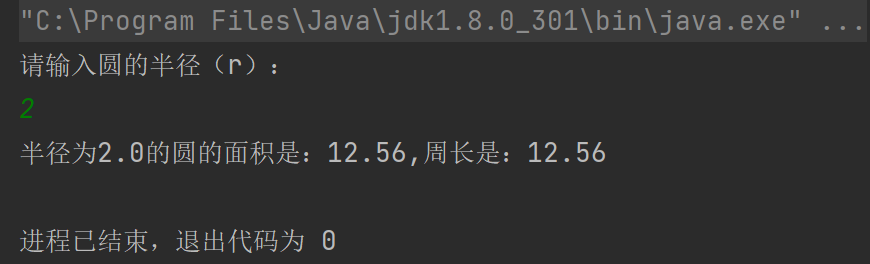 package blog.dome.zhaojiaao; import java.util.Scanner; public class dome02 { //输入一个圆半径(r),计算并输出圆的面积和周长。 public static void main(String[] args) { Scanner sc = new Scanner(System.in); System.out.println("请输入圆的半径(r):"); double r = sc.nextDouble(); double area = 3.14 * r * r; double girth = 2 * 3.14 * r; System.out.println("半径为" + r + "的圆的面积是:" + area + ",周长是:" + girth); } }