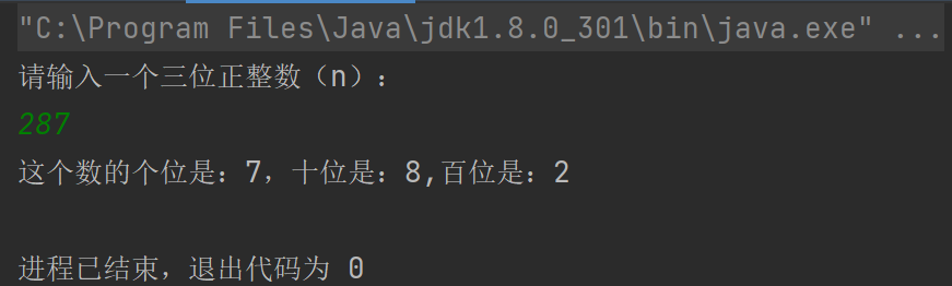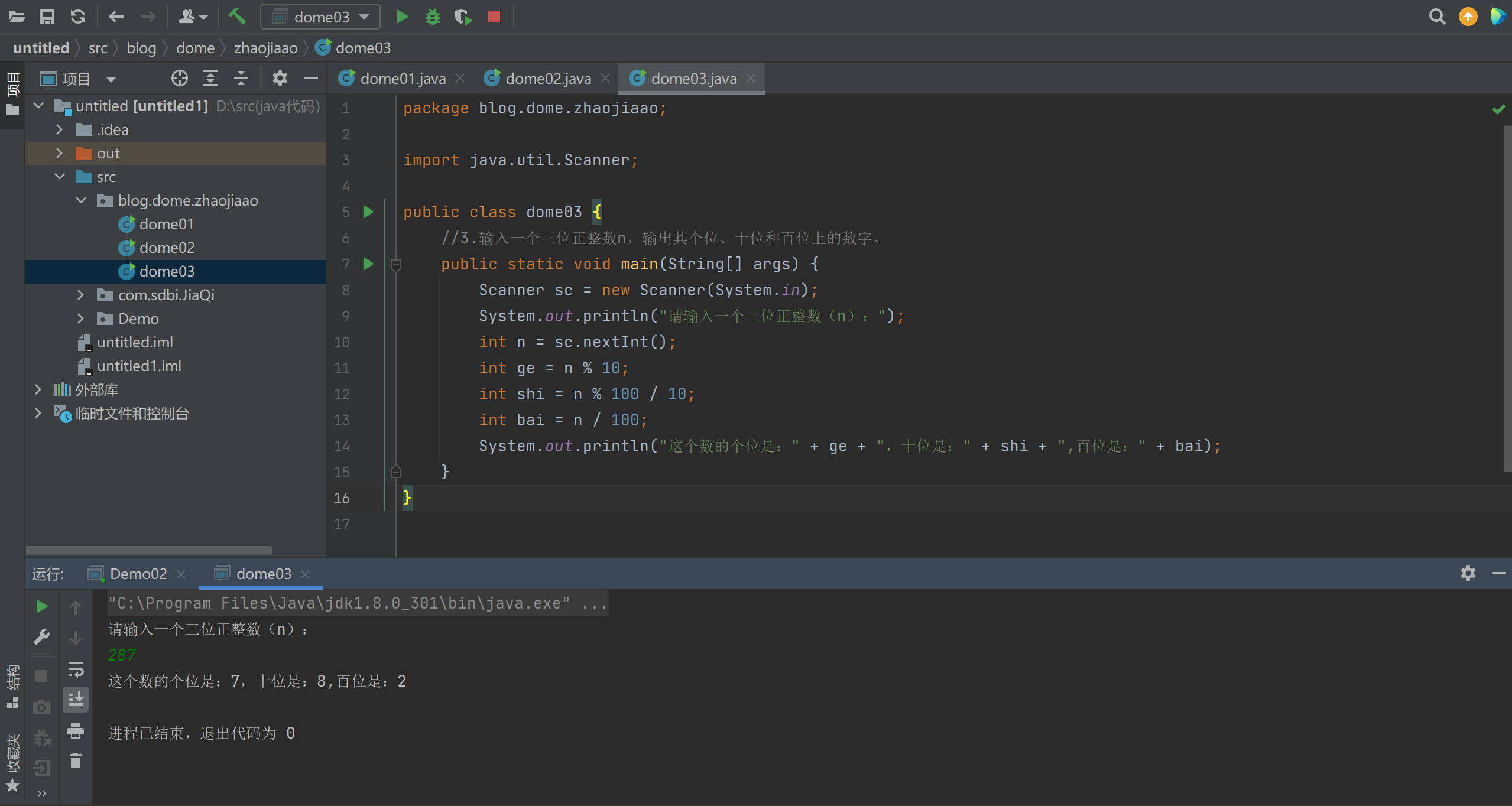 package blog.dome.zhaojiaao; import java.util.Scanner; public class dome03 { //3.输入一个三位正整数n,输出其个位、十位和百位上的数字。 public static void main(String[] args) { Scanner sc = new Scanner(System.in); System.out.println("请输入一个三位正整数(n):"); int n = sc.nextInt(); int ge = n % 10; int shi = n % 100 / 10; int bai = n / 100; System.out.println("这个数的个位是:" + ge + ",十位是:" + shi + ",百位是:" + bai); } }