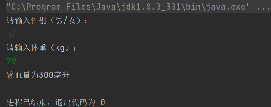 男性不超过60kg的输血量为250毫升,否则300毫升。要求:输入性别和体重,输出输血量。