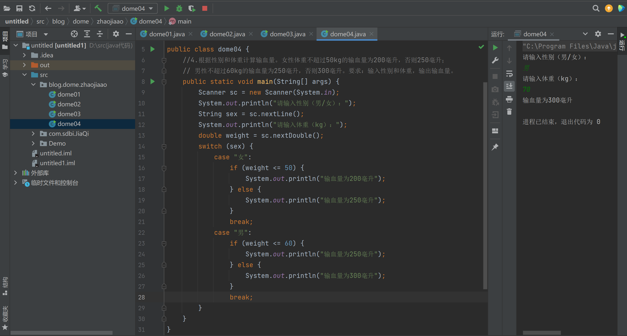 package blog.dome.zhaojiaao; import java.util.Scanner; public class dome04 { //4.根据性别和体重计算输血量。女性体重不超过50kg的输血量为200毫升,否则250毫升; // 男性不超过60kg的输血量为250毫升,否则300毫升。要求:输入性别和体重,输出输血量。 public static void main(String[] args) { Scanner sc = new Scanner(System.in); System.out.println("请输入性别(男/女):"); String sex = sc.nextLine(); System.out.println("请输入体重(kg):"); double weight = sc.nextDouble(); switch (sex) { case "女": if (weight <= 50) { System.out.println("输血量为200毫升"); } else { System.out.println("输血量为250毫升"); } break; case "男": if (weight <= 60) { System.out.println("输血量为250毫升"); } else { System.out.println("输血量为300毫升"); } break; } } }