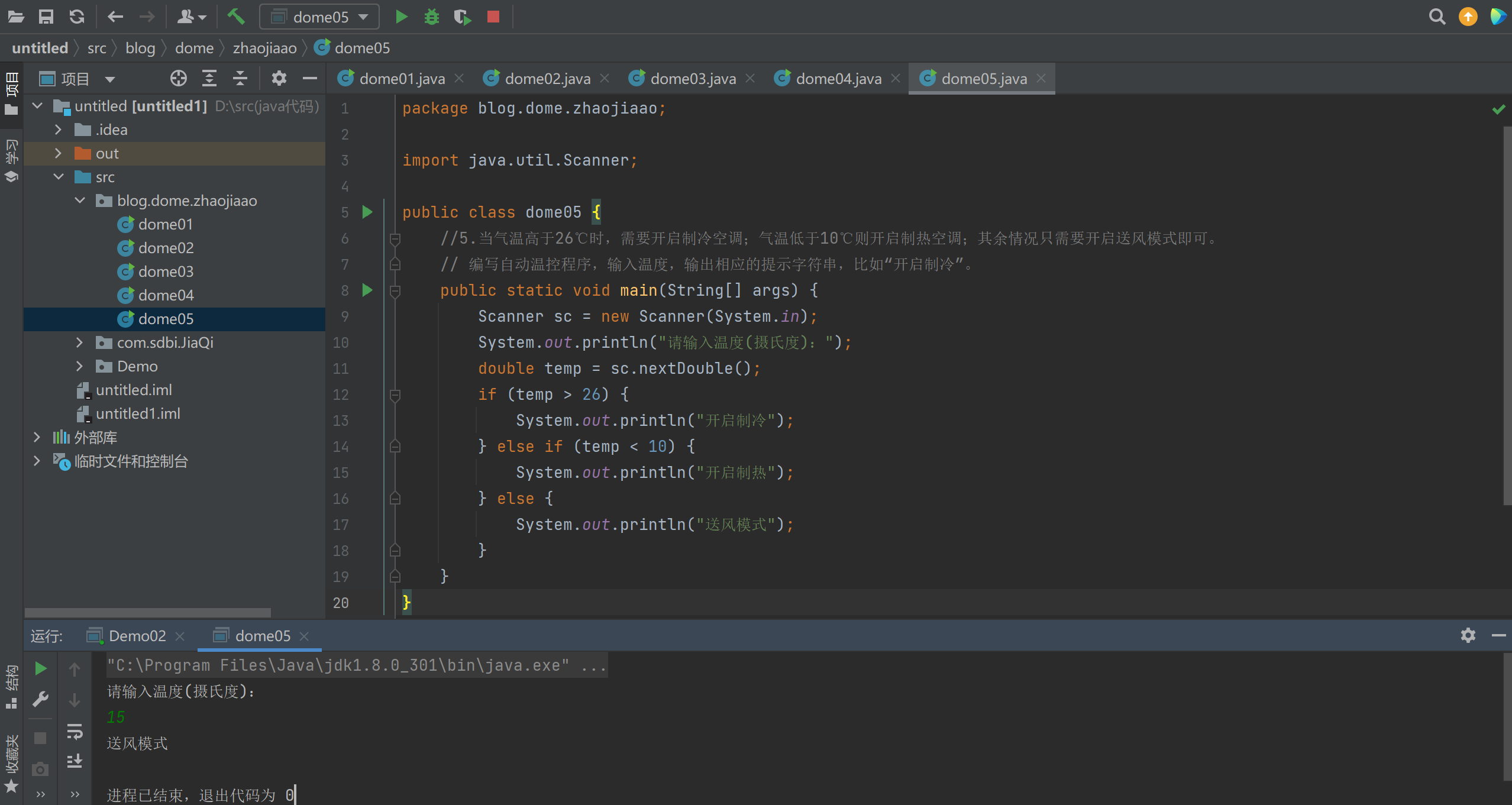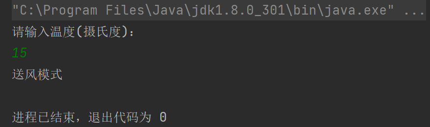 package blog.dome.zhaojiaao; import java.util.Scanner; public class dome05 { //5.当气温高于26℃时,需要开启制冷空调;气温低于10℃则开启制热空调;其余情况只需要开启送风模式即可。 // 编写自动温控程序,输入温度,输出相应的提示字符串,比如“开启制冷”。 public static void main(String[] args) { Scanner sc = new Scanner(System.in); System.out.println("请输入温度(摄氏度):"); double temp = sc.nextDouble(); if (temp > 26) { System.out.println("开启制冷"); } else if (temp < 10) { System.out.println("开启制热"); } else { System.out.println("送风模式"); } } }