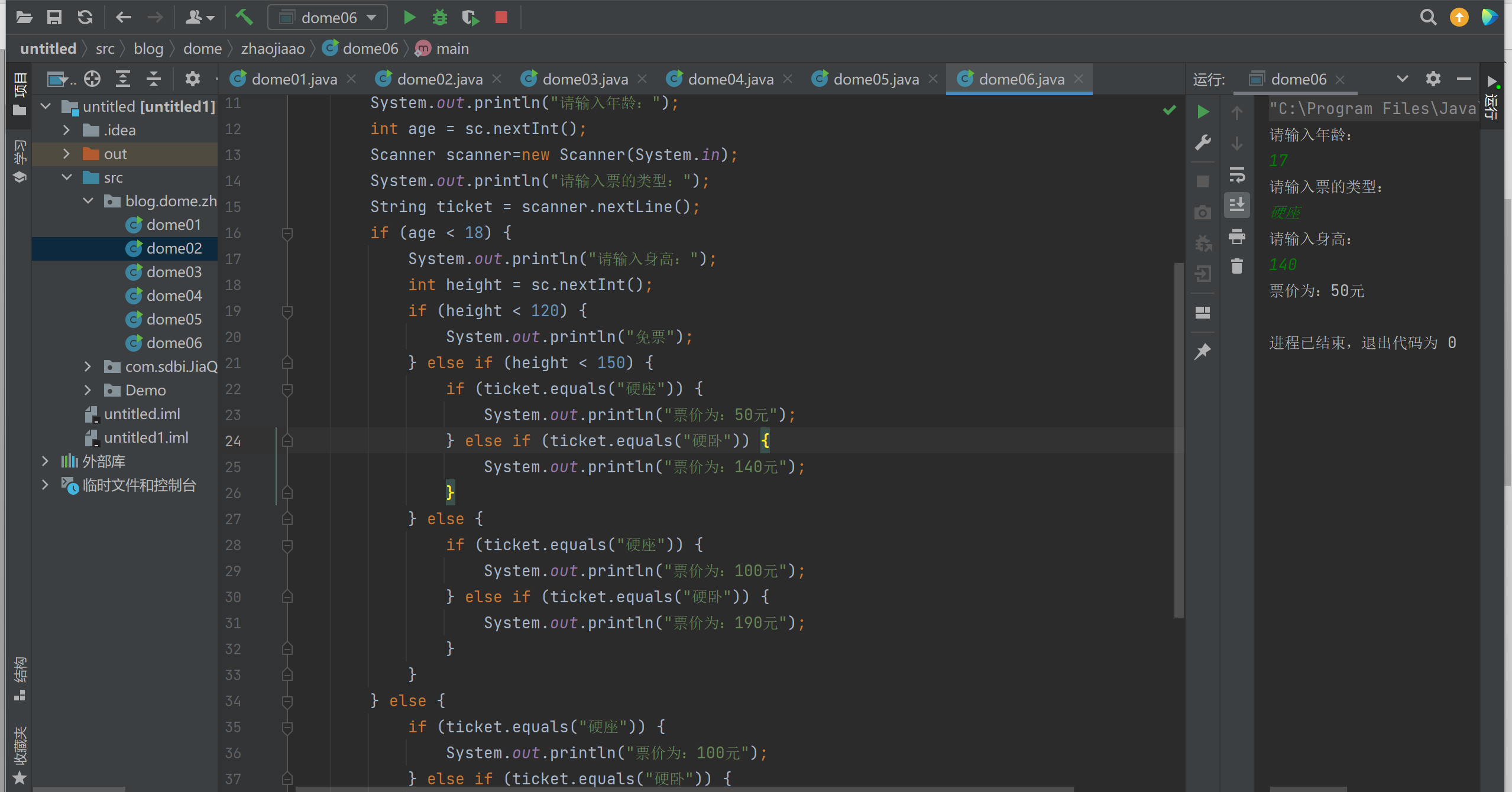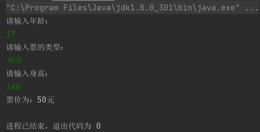 package blog.dome.zhaojiaao; import java.util.Scanner; public class dome06 { //6、假设从A地到B地的火车票有硬座和硬卧,价格分别为100和190元。 // 根据铁路部门规定,未成年人(18周岁以下)身高不足120cm免票,120(含)-150(不含)cm需半票,150及以上的需全票, // 未成年人卧铺只能减免硬座的半价。请设计一个购票程序,要求输入年龄和身高(未成人需要输入)以及票的类型,输出票的价。 public static void main(String[] args) { Scanner sc = new Scanner(System.in); System.out.println("请输入年龄:"); int age = sc.nextInt(); Scanner scanner=new Scanner(System.in); System.out.println("请输入票的类型:"); String ticket = scanner.nextLine(); if (age < 18) { System.out.println("请输入身高:"); int height = sc.nextInt(); if (height < 120) { System.out.println("免票"); } else if (height < 150) { if (ticket.equals("硬座")) { System.out.println("票价为:50元"); } else if (ticket.equals("硬卧")) { System.out.println("票价为:140元"); } } else { if (ticket.equals("硬座")) { System.out.println("票价为:100元"); } else if (ticket.equals("硬卧")) { System.out.println("票价为:190元"); } } } else { if (ticket.equals("硬座")) { System.out.println("票价为:100元"); } else if (ticket.equals("硬卧")) { System.out.println("票价为:190元"); } } }