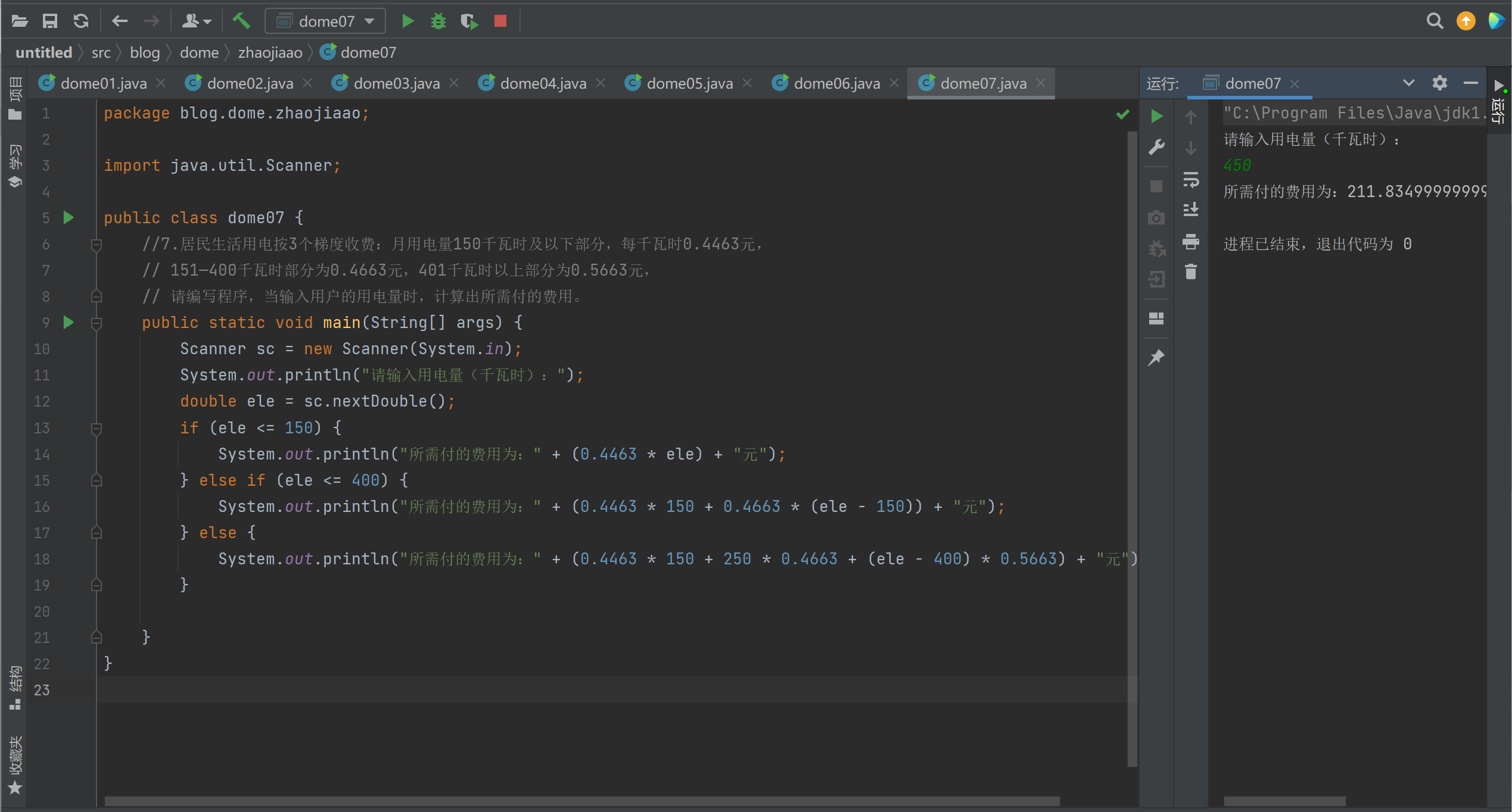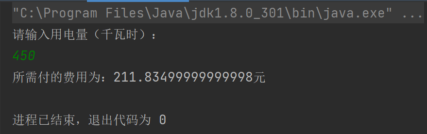 package blog.dome.zhaojiaao; import java.util.Scanner; public class dome07 { //7.居民生活用电按3个梯度收费:月用电量150千瓦时及以下部分,每千瓦时0.4463元, // 151—400千瓦时部分为0.4663元,401千瓦时以上部分为0.5663元, // 请编写程序,当输入用户的用电量时,计算出所需付的费用。 public static void main(String[] args) { Scanner sc = new Scanner(System.in); System.out.println("请输入用电量(千瓦时):"); double ele = sc.nextDouble(); if (ele <= 150) { System.out.println("所需付的费用为:" + (0.4463 * ele) + "元"); } else if (ele <= 400) { System.out.println("所需付的费用为:" + (0.4463 * 150 + 0.4663 * (ele - 150)) + "元"); } else { System.out.println("所需付的费用为:" + (0.4463 * 150 + 250 * 0.4663 + (ele - 400) * 0.5663) + "元"); } } }