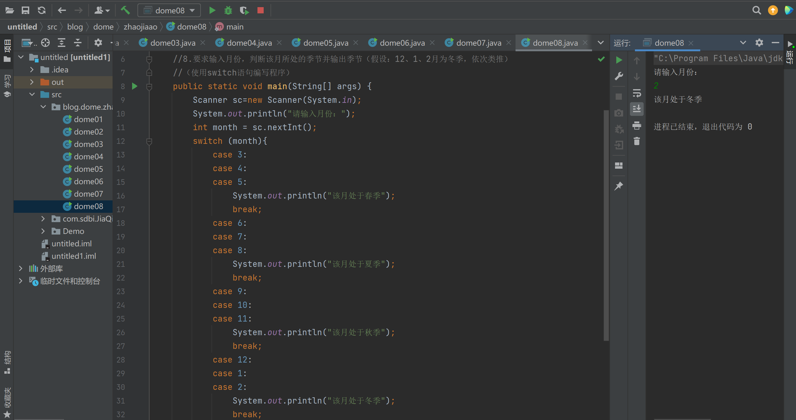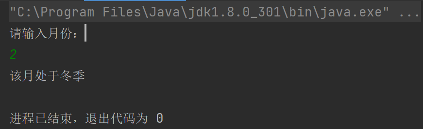 package blog.dome.zhaojiaao; import java.util.Scanner; public class dome08 { //8.要求输入月份,判断该月所处的季节并输出季节(假设:12、1、2月为冬季,依次类推) //(使用switch语句编写程序) public static void main(String[] args) { Scanner sc=new Scanner(System.in); System.out.println("请输入月份:"); int month = sc.nextInt(); switch (month){ case 3: case 4: case 5: System.out.println("该月处于春季"); break; case 6: case 7: case 8: System.out.println("该月处于夏季"); break; case 9: case 10: case 11: System.out.println("该月处于秋季"); break; case 12: case 1: case 2: System.out.println("该月处于冬季"); break; } } }