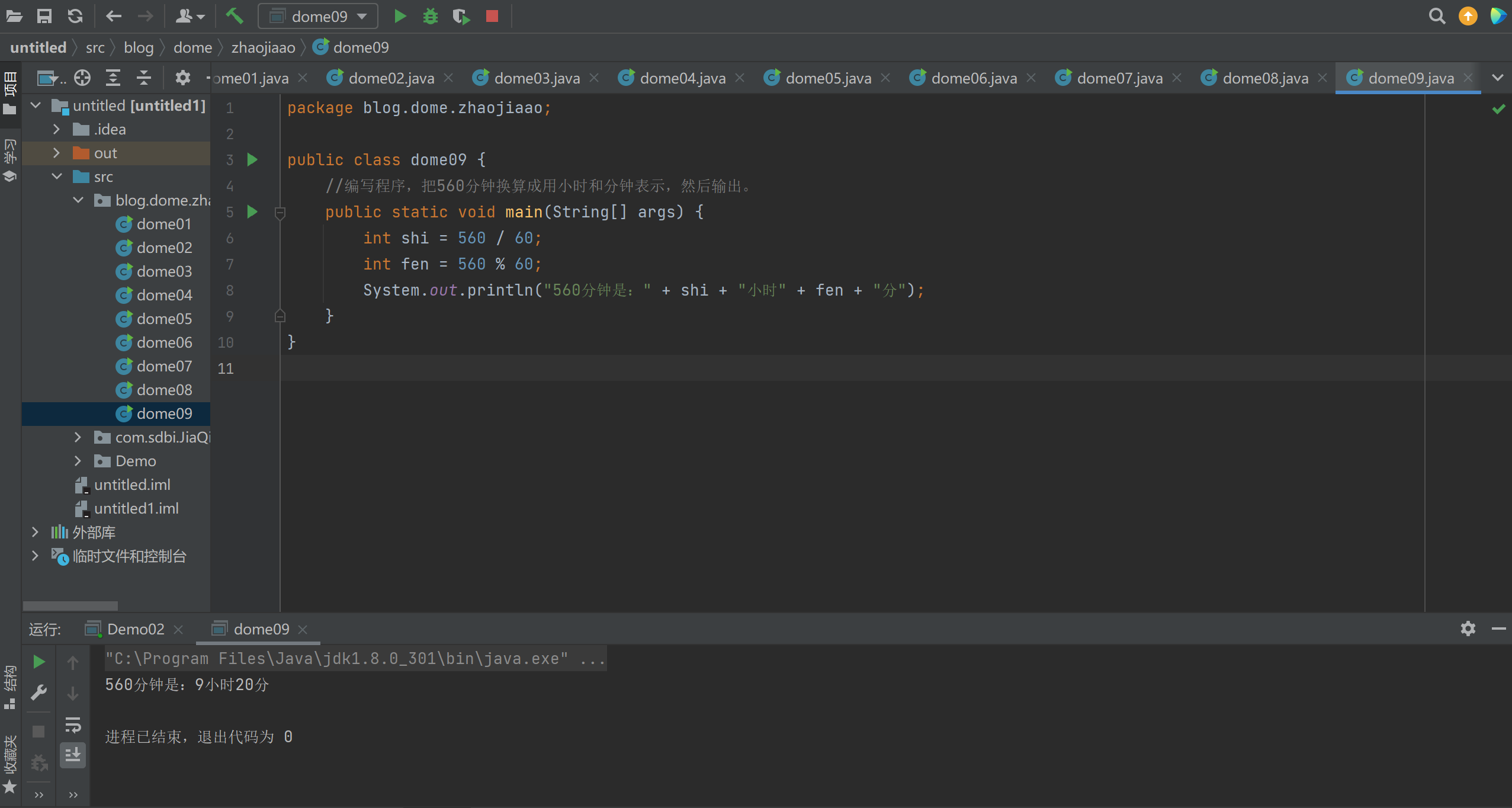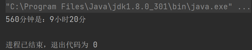 package blog.dome.zhaojiaao; public class dome09 { //编写程序,把560分钟换算成用小时和分钟表示,然后输出。 public static void main(String[] args) { int shi = 560 / 60; int fen = 560 % 60; System.out.println("560分钟是:" + shi + "小时" + fen + "分"); } }