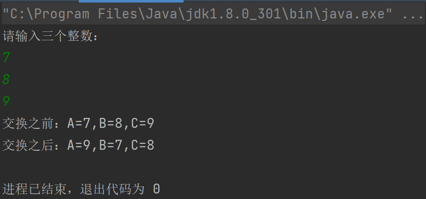10.输入三个整数A、B和C,将它们交换(即A的值给B,B的值给C,C的值给A)后输出A、B和C。