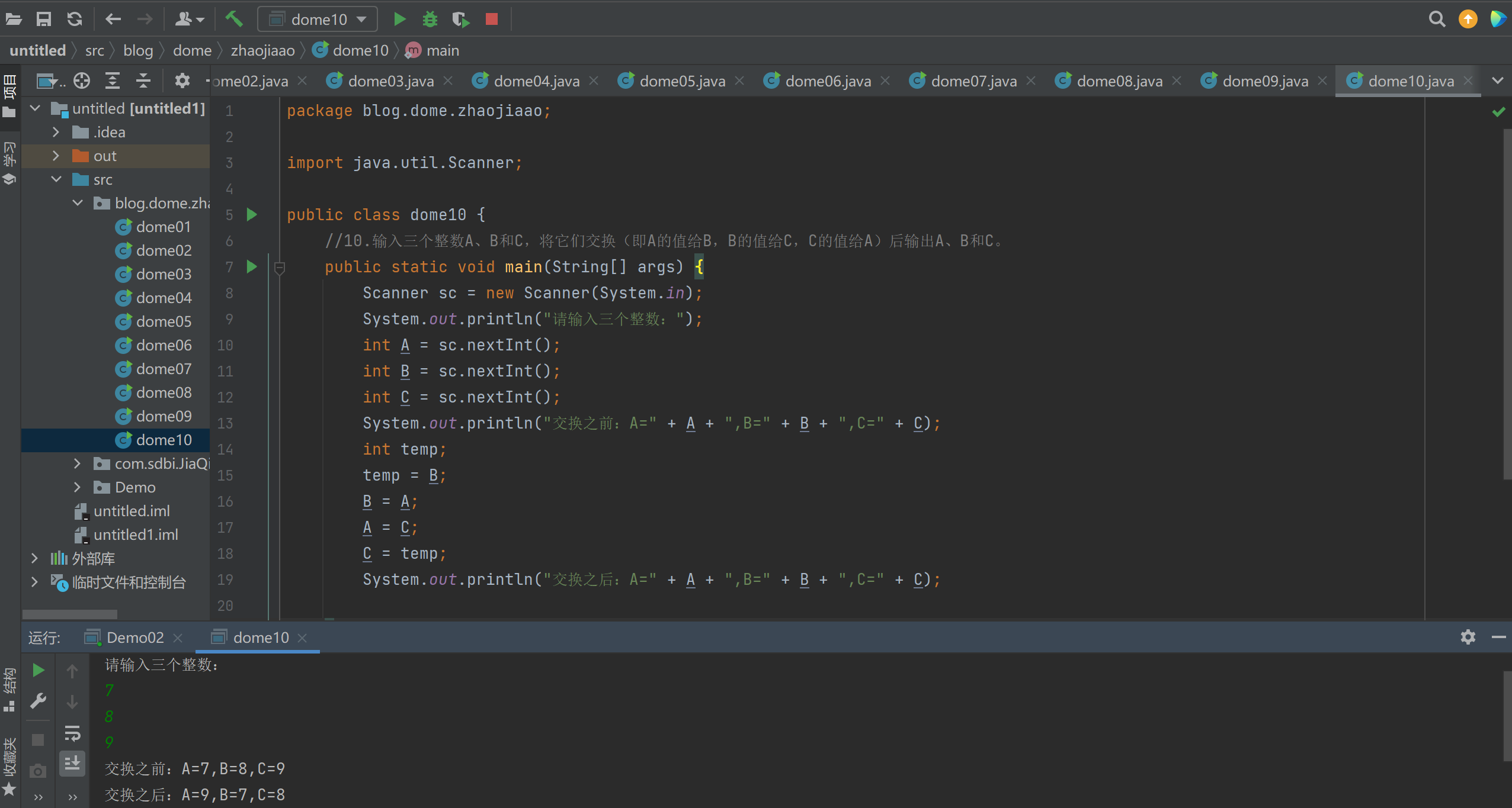 package blog.dome.zhaojiaao; import java.util.Scanner; public class dome10 { //10.输入三个整数A、B和C,将它们交换(即A的值给B,B的值给C,C的值给A)后输出A、B和C。 public static void main(String[] args) { Scanner sc = new Scanner(System.in); System.out.println("请输入三个整数:"); int A = sc.nextInt(); int B = sc.nextInt(); int C = sc.nextInt(); System.out.println("交换之前:A=" + A + ",B=" + B + ",C=" + C); int temp; temp = B; B = A; A = C; C = temp; System.out.println("交换之后:A=" + A + ",B=" + B + ",C=" + C); } }