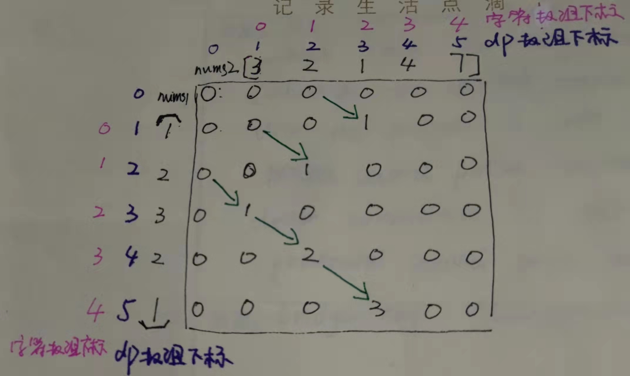 - 找到了一个公共元素,dp[i][j] = dp[i - 1][j - 1] + 1;