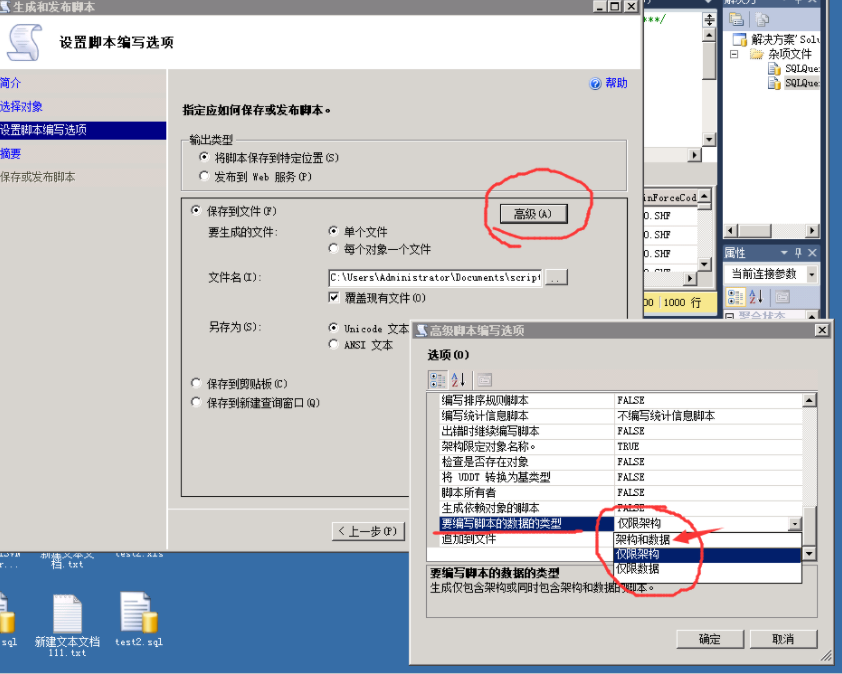 4、脚本导出界面-高级-要编写的脚本数据类型-架构和数据,就可以把表结构和数据一起导出